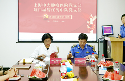 上海中大肿瘤医院党支部代表与虹口城管江湾中队相关负责人开展交流座谈,就进一步加强共建联建、整合资源、共同发展等工作内容进行探讨,并签署了《党建联建协议书》,双方党支部负责人分别派代表在协议上签字。