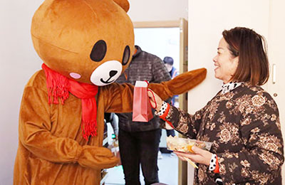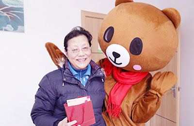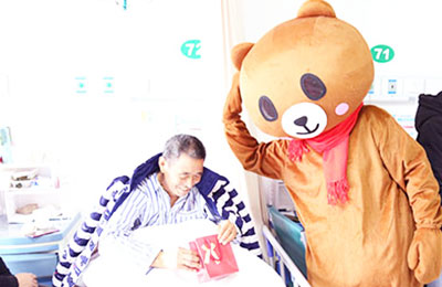 1月1日上午,病房门口传来了敲门声,打开门患者们都对病房内突然闯入的“陌生熊”感到意外,当得知是医院特意为他们送上新年祝福而准备的小惊喜后,一个个都开心地露出了笑脸。